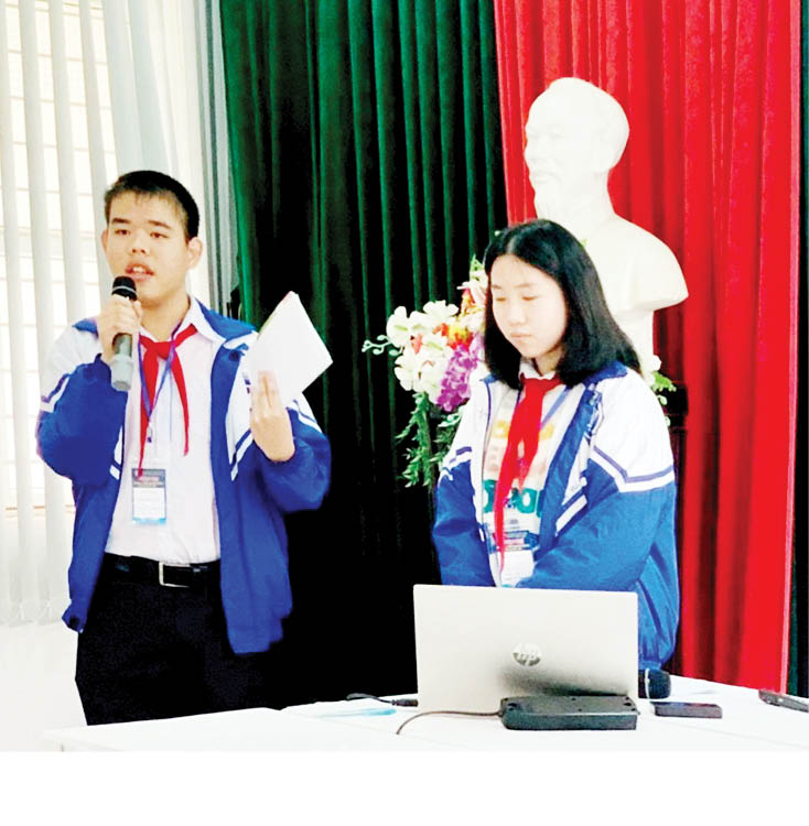 Đăng Khoa và Anh Châu đang giới thiệu đề tài của mình trong cuộc thi KHKT