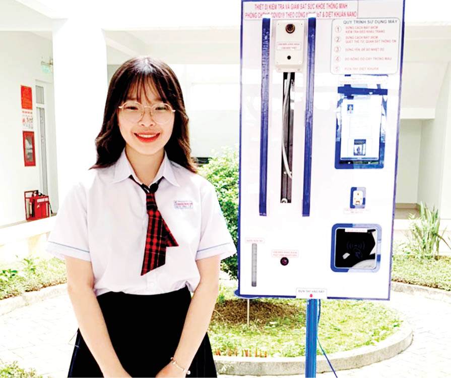 Tình hình dịch COVID-19 diễn biến phức tạp đã thúc đẩy Lê Ngọc Thanh Mai, HS lớp 9/1 Trường THCS Nguyễn Tri Phương tìm tòi nghiên cứu để sáng chế “Thiết bị kiểm tra và giám sát sức khỏe thông minh phòng chống COVID-19 theo công nghệ IOT và diệt khuẩn NANO”.
