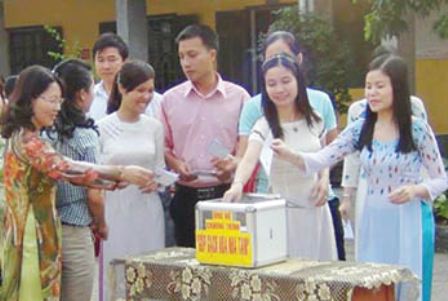 Giáo viên tham gia "Góp gạch" trong giờ chào cờ. Ảnh: Lê Triều