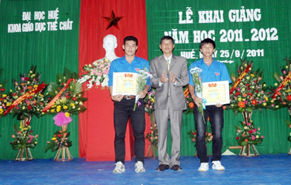 Nguyễn Khắc Nhật (đầu tiên, bên trái) nhận Giấy khen danh hiệu sinh viên giỏi năm học 2011-2012