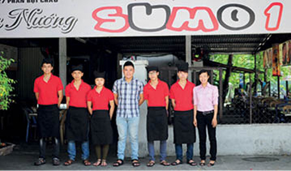 Văn Hoàng (áo ca rô ở giữa) cùng các nhân viên quán Sumo 1