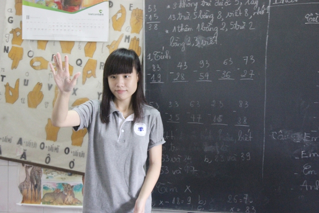 Quan sát em đứng lớp, chúng tôi vô cùng xúc động khi nụ cười của em luôn nở trên môi, những ký hiệu bằng tay được em sử dụng để giảng bài cho lớp trẻ khiếm thính dễ hiểu. Thảo Phương chia sẻ: “Vì thương các em nên em xin vào đây để phụ giúp các cô giảng dạy. Mỗi tuần em làm từ thứ 2 đến thứ 6, dạy ngôn ngữ ký hiệu, thể dục dân vũ, múa hát, làm các thiệp giấy, giúp cho các em ăn cơm, vệ sinh”.