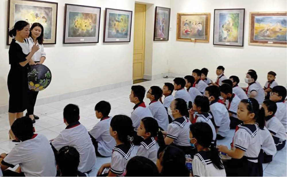 Học sinh Trường tiểu học Lê Lợi tham quan phòng tranh của họa sĩ Đặng Mậu Tựu