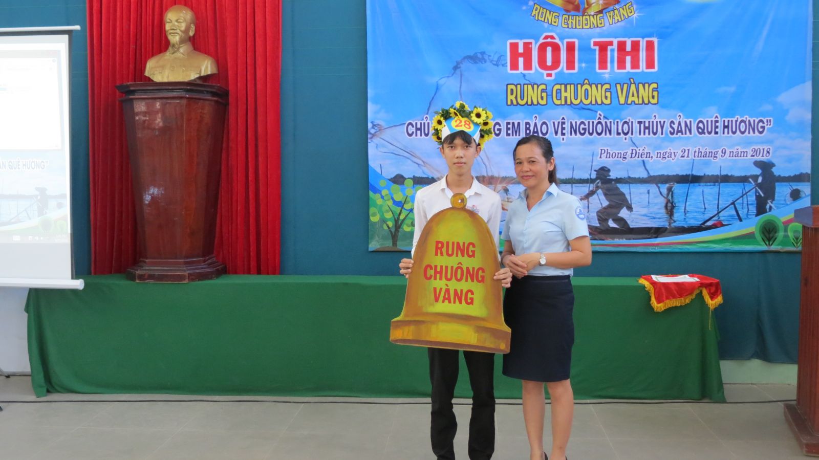 Bà Phan Thị Thu Hồng – Chi cục Phó, Chi cục Thủy sản tỉnh trao rung chuông vàng cho em Võ Quang Nhân học sinh lớp 11 B2 trường THPT Phong Điền