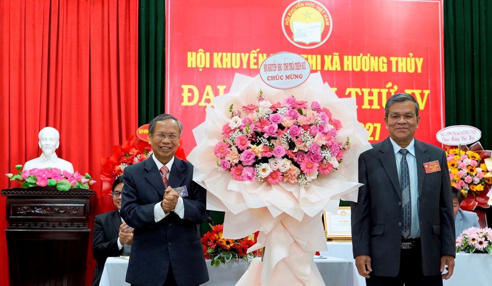 Ông Phan Công Tuyên - Chủ tịch Hội Khuyến học tỉnh (trái) tặng hoa chúc mừng Hội Khuyến học TX. Hương Thủy