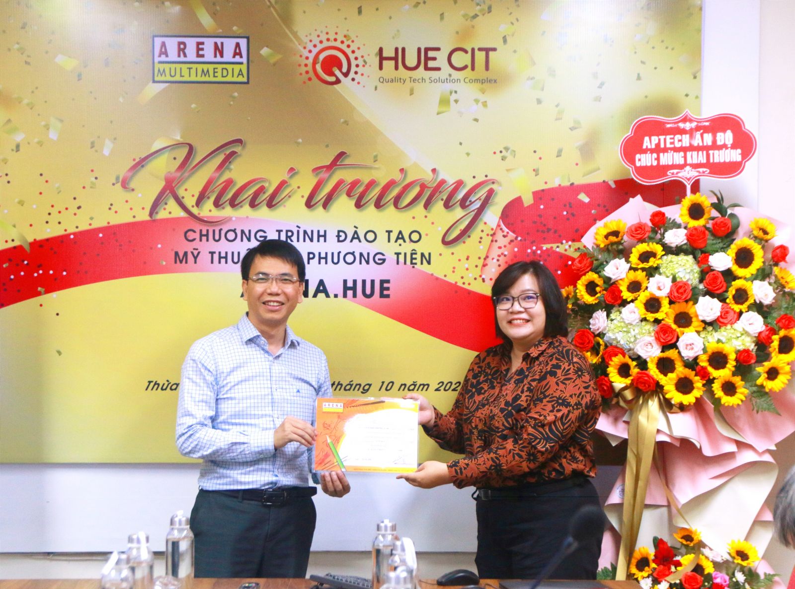 Bà Lê Hữu Trâm Anh, Đại diện Tập đoàn Aptech tại Việt Nam trao giấy chứng nhận nhượng quyền đào tạo Chương trình Mỹ thuật Đa phương tiện ARENA Multimedia cho HueCIT