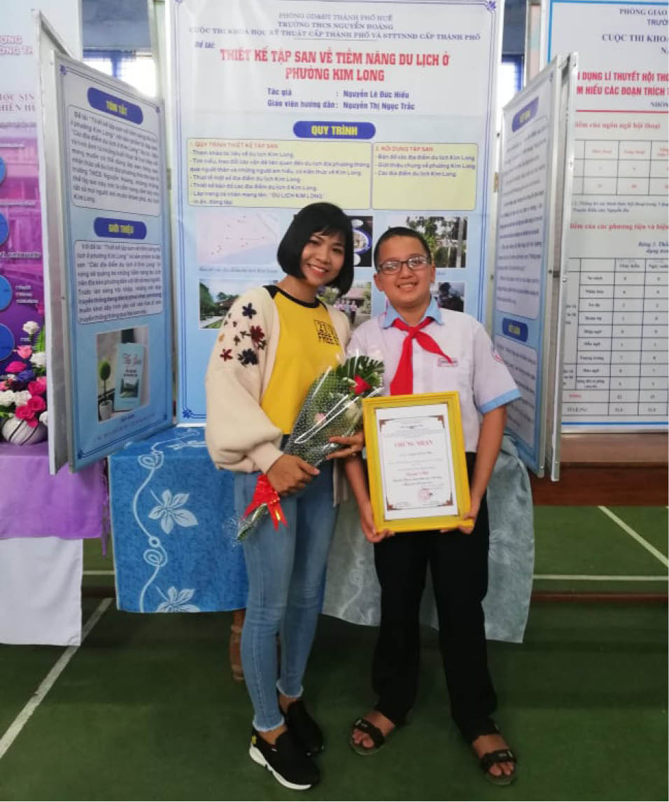 Đức Hiếu chia sẻ, đề tài “Thiết kế tập san về tiềm năng du lịch ở phường Kim Long” được thực hiện trong gần hai năm với sự giúp đỡ tận tình của cô giáo hướng dẫn Nguyễn Thị Ngọc Trắc. Đó là tình yêu em dành cho mảnh đất đang sinh sống và gắn bó; đồng thời, mong muốn sản phẩm này sẽ trở thành đồ dùng học tập, giúp khơi dậy tình yêu quê hương trong các bạn ở Trường THCS Nguyễn Hoàng. Công trình của em đoạt giải nhì trong cuộc thi sáng tạo thanh thiếu niên, nhi đồng toàn tỉnh và được em gửi tham dự cuộc thi sáng tạo thanh thiếu niên, nhi đồng toàn quốc lần thứ XV năm 2019.