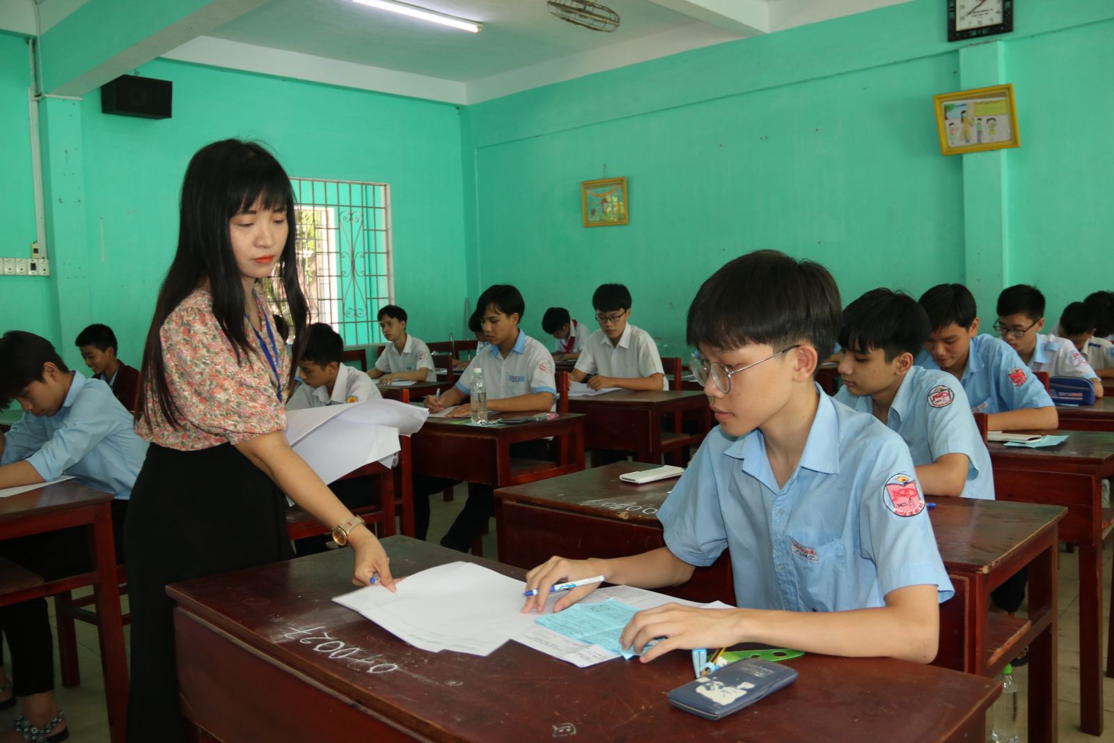 Cán bộ coi thi phát giấy nháp cho thí sinh. Ảnh: Hữu Phúc