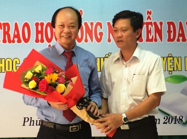 Lãnh đạo huyện Phú Lộc (bên phải) tặng hoa nhà tài trợ