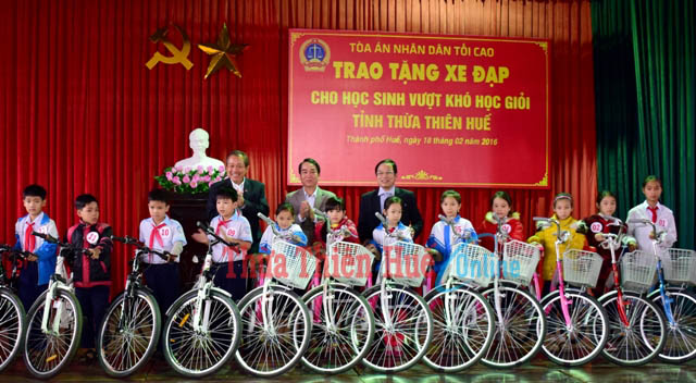 HNN.VN - Chiều 18/2, Ủy viên Bộ Chính trị, Chánh án TAND tối cao Trương Hòa Bình trao tặng 50 xe đạp cho 50 học sinh nghèo hiếu học của thành phố Huế. Cùng đi có Phó Bí thư Thường trực Tỉnh ủy Bùi Thanh Hà.