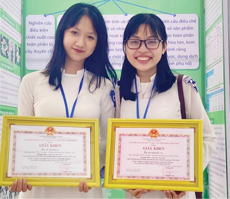 Với những nỗ lực, cố gắng cùng niềm đam mê, tìm tòi không ngừng nghỉ, đề tài “Nghiên cứu các thành phần hóa học và hoạt tính sinh học của cây xuyến chi ở tỉnh Thừa Thiên Huế” của hai nữ sinh Diệu Na và Như Ý đã đạt giải nhất của cuộc thi Sáng tạo Khoa học – Kỹ thuật học sinh trung học cấp tỉnh, năm học 2021 - 2022.