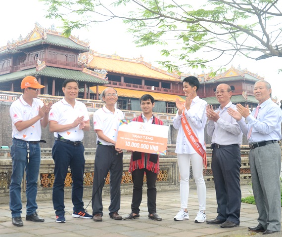 HNN.VN - Trong khuôn khổ các hoạt động xã hội tại những nơi Cuộc đua xe đạp xuyên Việt tranh cúp truyền hình TP. Hồ Chí Minh lần thứ 30-2018 đi qua, với vai trò đại sứ của giải, sáng 6/4, Hoa hậu Hoàn vũ 2018 H’Hen Niê cùng đại diện Tôn Đông Á, Quỹ Giáo dục Huế hiếu học có mặt trước Đại nội Huế để trao Học bổng đặc biệt cho học sinh nghèo hiếu học trị giá 10 triệu đồng cho Hồ Văn Kiểm, người Pa cô (A Lưới), hiện đang là sinh viên năm 2 Đại học Luật (ĐH Huế).