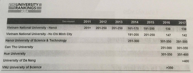 Hiện nay chưa có cái tên nào của Việt Nam lọt vào 3 bảng xếp hạng toàn cầu uy tín kể trên. Trong Bảng xếp hạng QS châu Á 2017, ĐHQG Hà Nội và ĐHQG TP.HCM lần lượt giữ vị trí 139 và 142. Trong bảng xếp hạng theo ngành của QS năm 2017 cũng đã có mặt 2 trường đại học Việt Nam với ngành Ngôn ngữ học của ĐHQG Hà Nội và ngành Ngôn ngữ hiện đại của ĐHQG TP.HCM.