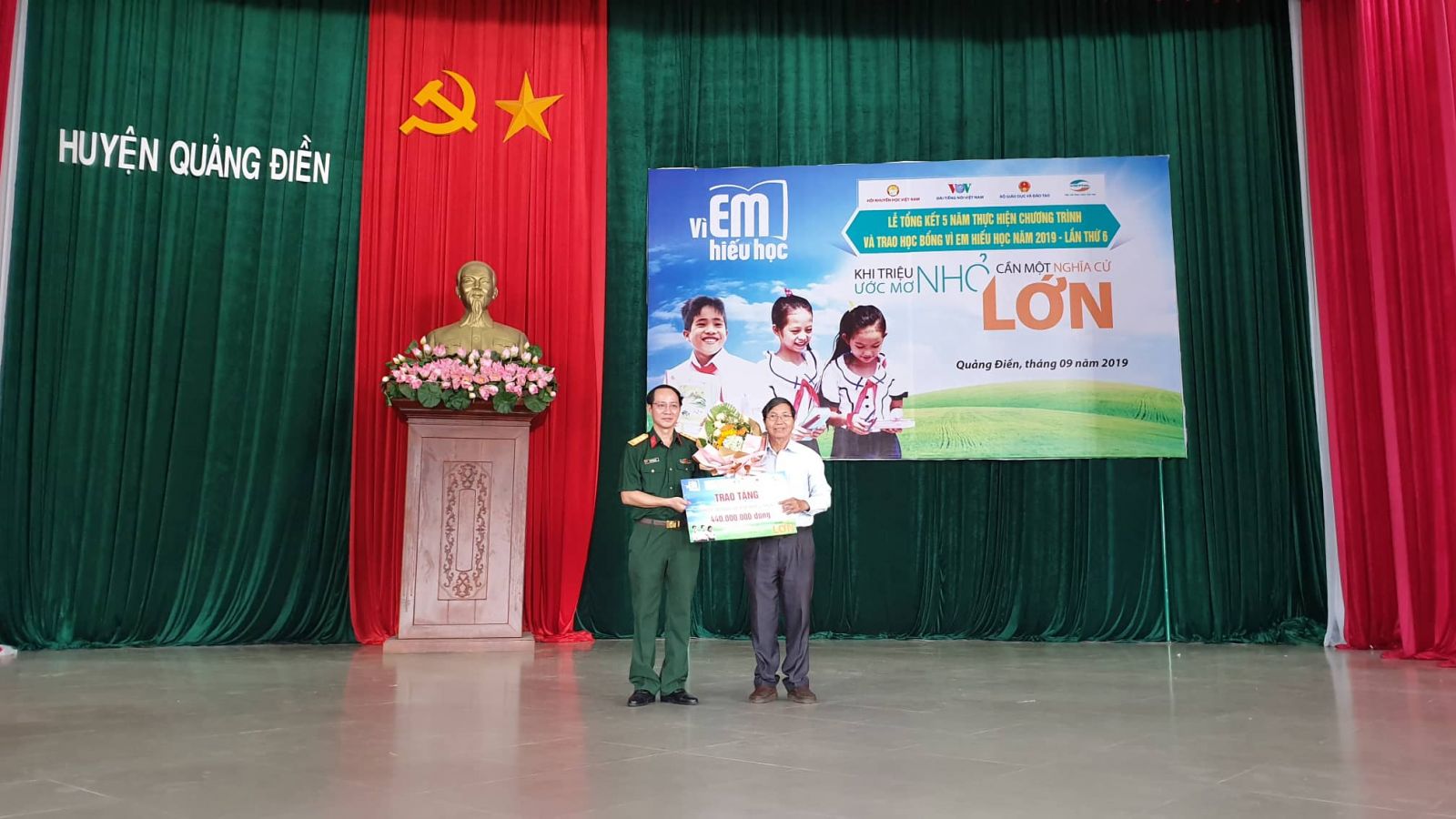 HNN.VN - Chiều 20/9, tại huyện Quảng Điền, Tập đoàn Công nghiệp-Viễn thông quân đội Chi nhánh Viettel Thừa Thiên Huế tổ chức tổng kết 5 năm thực hiện chương trình và trao học bổng “Vì em hiếu học” năm 2019 – lần thứ 6.