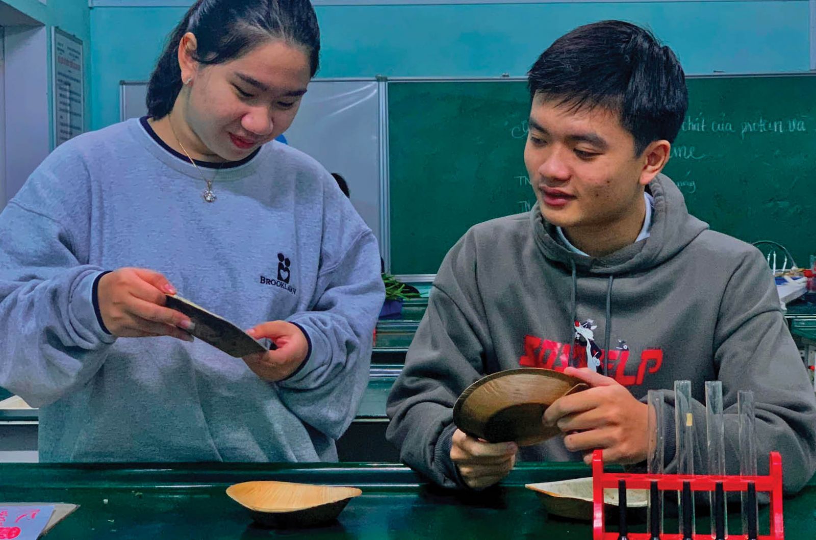 Huỳnh Thị Phương Liên và Võ Tá Thành Minh giới thiệu sản phẩm từ mo cau