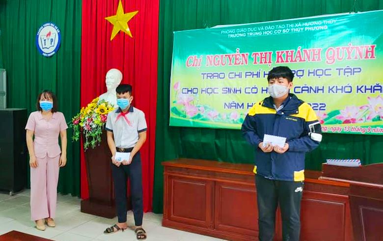 Cô Huỳnh Thị Thanh Hương - Hiệu trưởng Trường THCS Thủy Phương cho biết: “Thông qua kết nối giữa thầy Nguyễn Thịnh - Chủ tịch Công đoàn nhà trường, cựu học sinh Nguyễn Thị Khánh Quỳnh đã hỗ trợ số học bổng trên”.