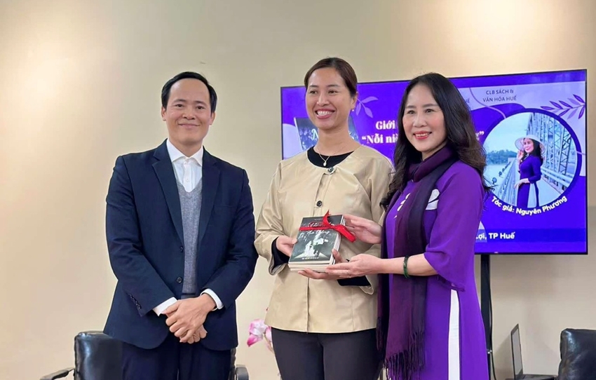 | Tác giả trao tặng sách "Nỗi niềm thời áo trắng" đến chị Trương Mỹ Dung-Chủ nhiệm CLB Sách và Văn hóa Huế |