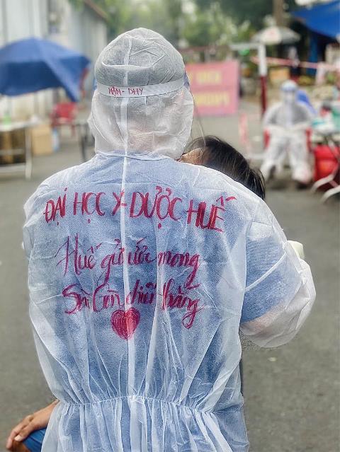 Dòng chữ ghi trên đồ bảo hộ của sinh viên tình nguyện Trường ĐH Y - Dược Huế