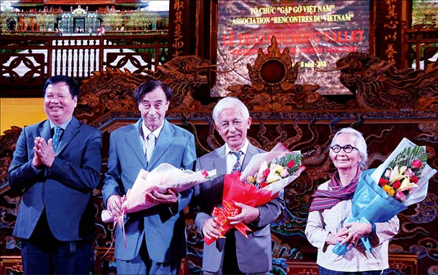 Phó Chủ tịch UBND tỉnh Nguyễn Dung (trái) trao hoa, cảm ơn những đóng góp của GS. Odon Vallet và vợ chồng GS. Trần Thanh Vân, Lê Kim Ngọc