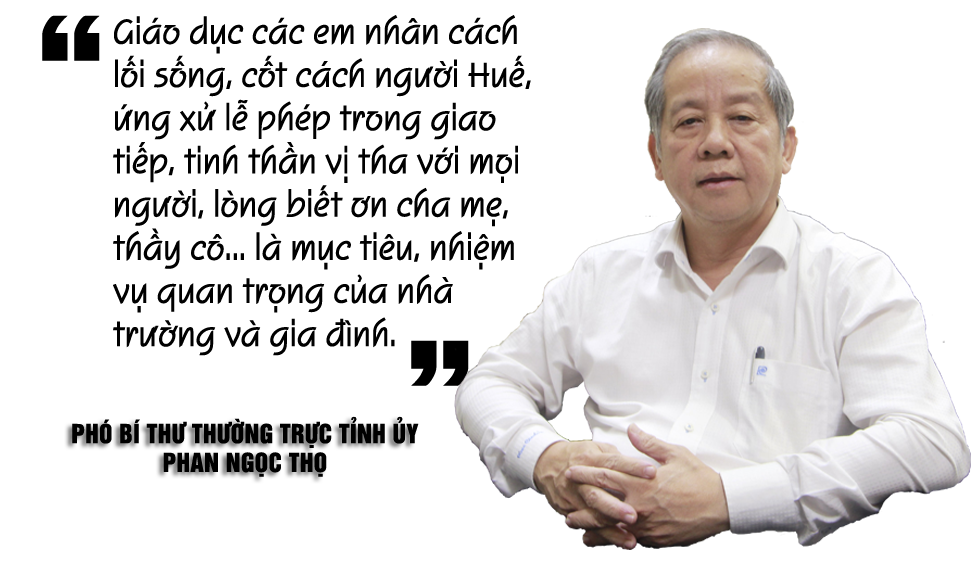 Trước hết, là việc xây dựng văn hóa ứng xử trong nhà trường. Giáo dục các em nhân cách lối sống, cốt cách người Huế, ứng xử lễ phép trong giao tiếp, tinh thần vị tha với mọi người, lòng biết ơn cha mẹ, thầy cô... là mục tiêu, nhiệm vụ quan trọng của nhà trường và gia đình. “Tiên học lễ hậu học văn” từ lâu đã trở thành mục tiêu trong nhiệm vụ trồng người của ngành giáo dục. "Học ăn, học nói, học gói, học mở" là những bài học vỡ lòng, thường xuyên của bao thế hệ học sinh xuyên suất các cấp học. Tăng cường các tiết ngoại khóa, thông qua các buổi nói chuyện của chuyên gia tâm lý, giáo dục để khắc phục tình trạng giáo điều trong dạy đạo đức. Dạy đạo đức phải có nhiều hình thức phù hợp lứa tuổi, liên tục ở các cấp học và được thực hành hàng ngày, hằng giờ khi các em đến trường.