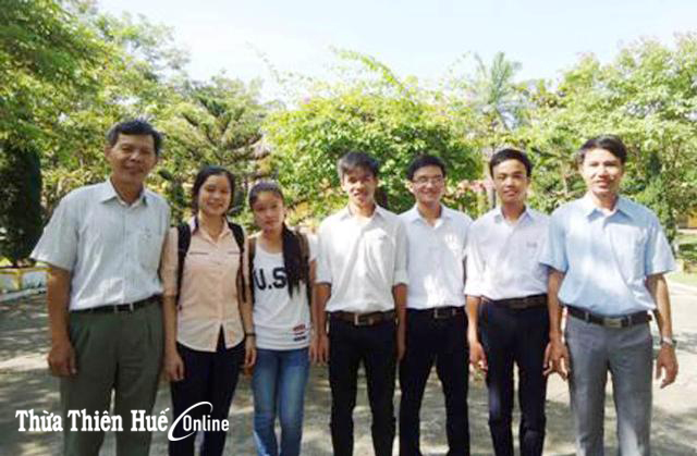Thầy Nguyễn Hối (ngoài cùng bên trái) chụp ảnh cùng các học sinh trường Đặng Huy Trứ đỗ thủ khoa và á khoa các trường đại học