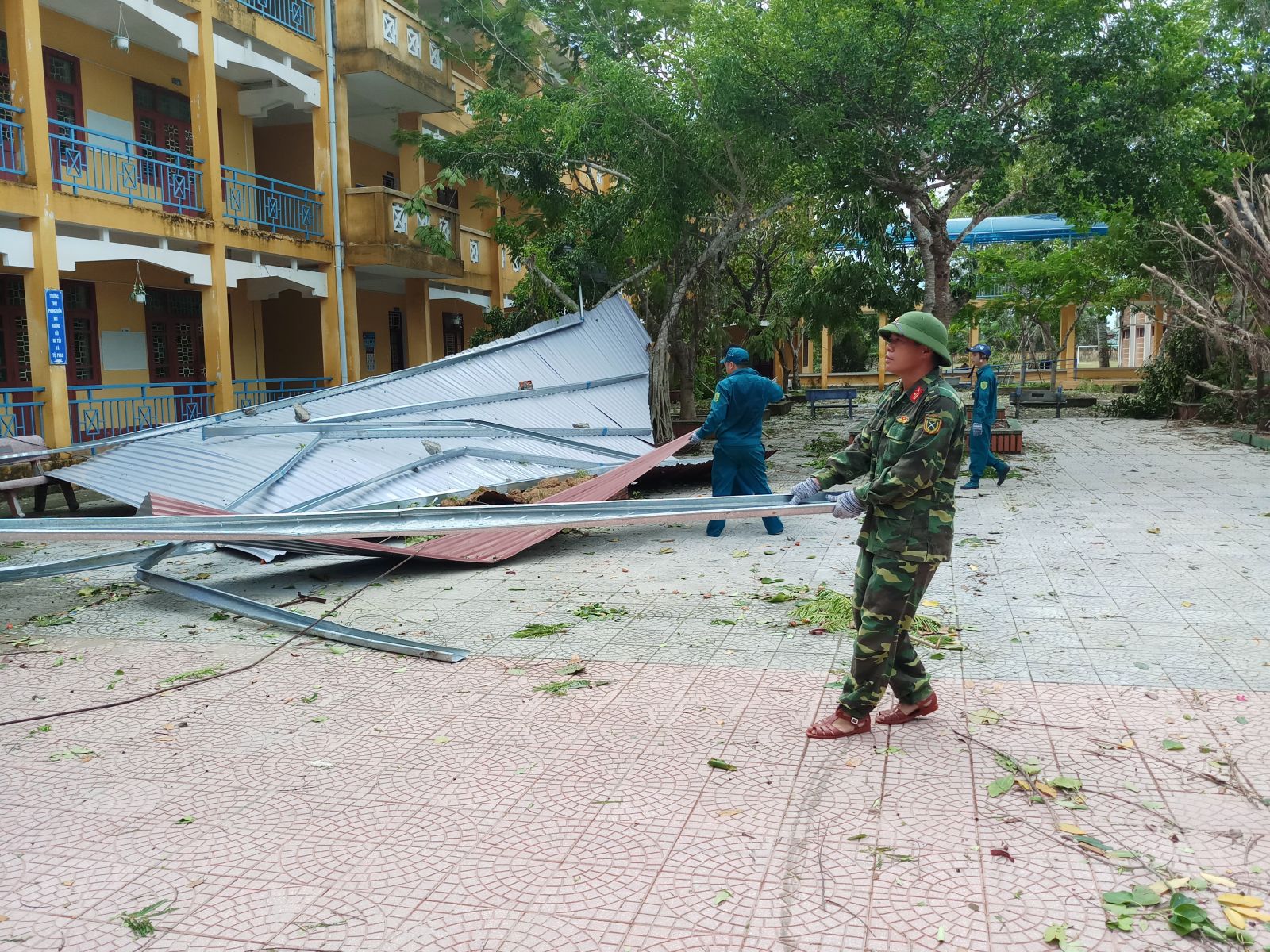 Lực lượng vũ trang huyện Phong Điền giúp Trường THPT Phong Điền dọn dẹp vệ sinh sau bão số 5