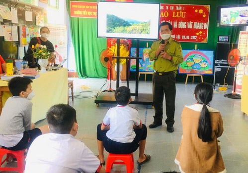 Học sinh được cán bộ kiểm lâm giới thiệu về bảo tồn ĐVHD