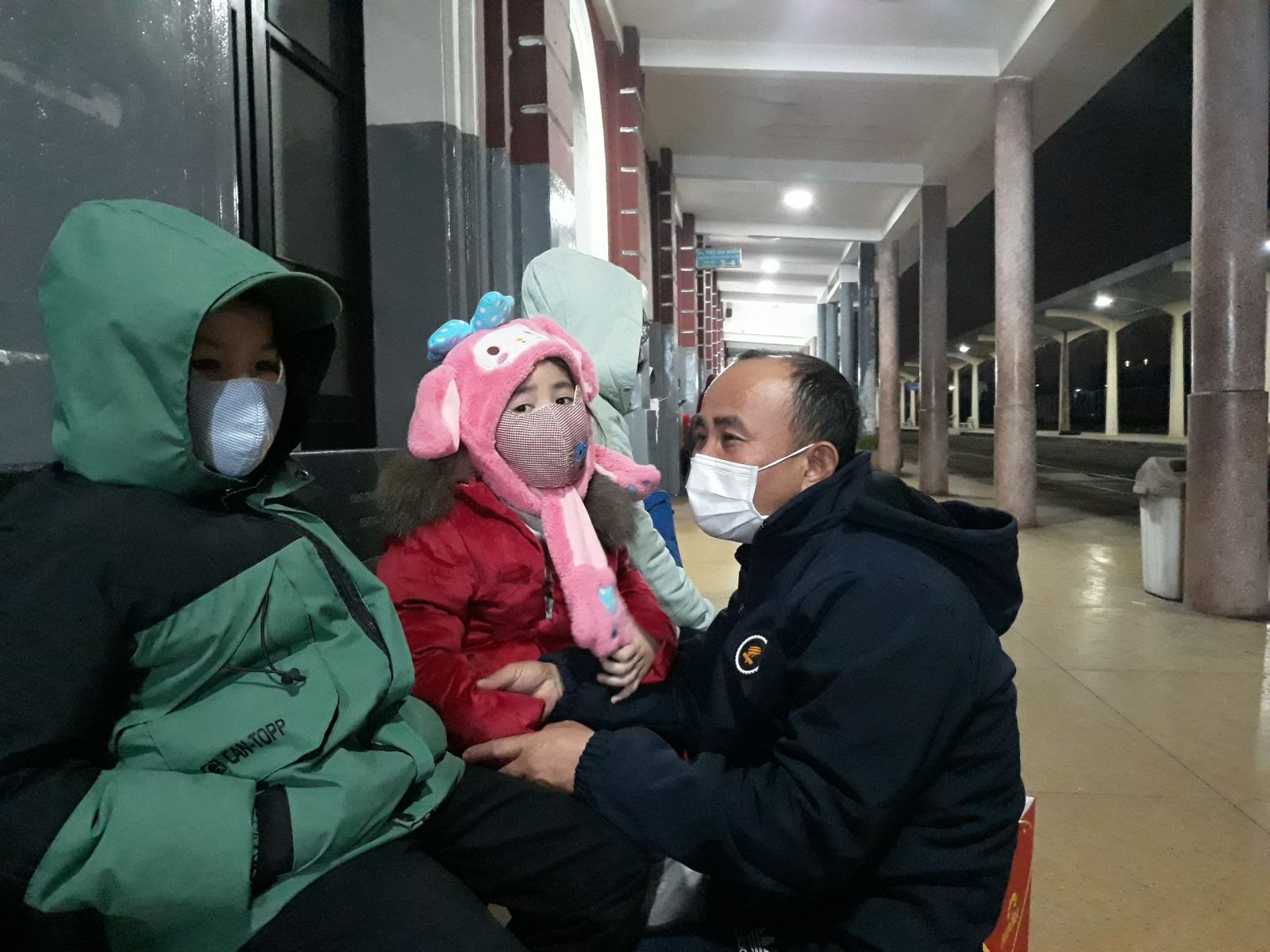 Một gia đình về quê ăn tết chờ chuyến tàu muộn