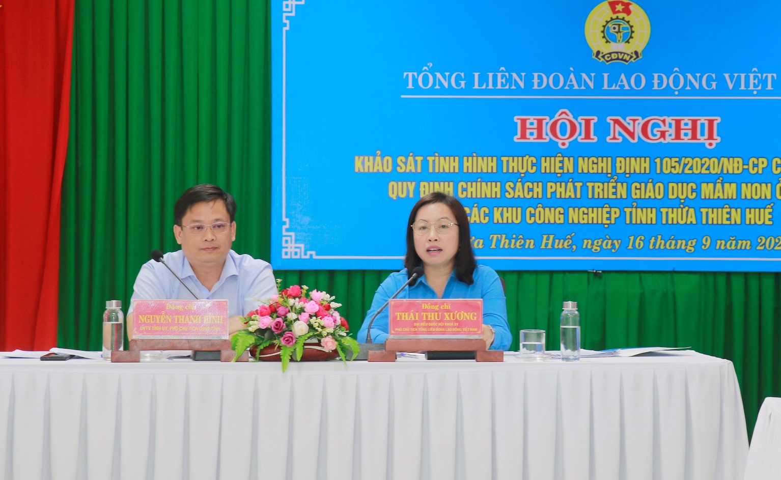 Đó là khẳng định của bà Thái Thu Xương, Phó Chủ tịch Tổng LĐLĐ Việt Nam tại hội nghị. Theo bà Thu Xương, hiện nay đã có 39/63 tỉnh thành ban hành nghị quyết theo Nghị định 105/2020/NĐ-CP của Chính phủ. Thừa Thiên Huế là một trong những tỉnh ban hành thực hiện sớm Nghị định 105, chưa kể, tỉnh còn có một số nội dung hỗ trợ cao hơn mức quy định tối thiếu của Chính phủ. Chẳng hạn, theo Nghị định 105/2020/NĐ-CP, mức hỗ trợ tối thiểu quy định là 20 triệu đồng, trong khi HĐND tỉnh đã thống nhất mức đề xuất hỗ trợ của tỉnh là 30.000.000 đồng/cơ sở giáo dục mầm non độc lập. Điều này thể hiện rõ sự quan tâm của địa phương trong thực hiện chính sách phát triển giáo dục mầm non ở địa bàn các khu công nghiệp trên địa bàn tỉnh.