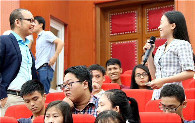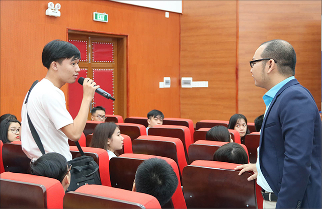 Diễn giả Lê Đình Hiếu tương tác với sinh viên ĐH Huế tại talkshow về khởi nghiệp