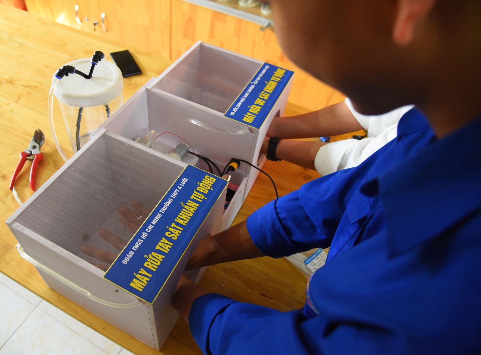 Nhóm nghiên cứu tiến hành sáng chế máy rửa tay sát khuẩn tự động tại Trường THPT A Lưới. Ảnh: NGỌC TOÀN