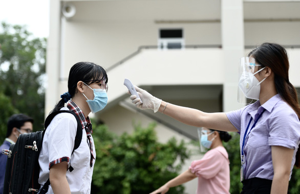 Sáng nay các biện pháp phòng dịch tiếp tục được thực hiện nghiêm. Trong ảnh: thí sinh đo thân nhiệt trước khi vào phong thi tại hội đồng thi trường THPT Nguyễn Hữu Thọ, quận 4, TP.HCM - Ảnh: TỰ TRUNG