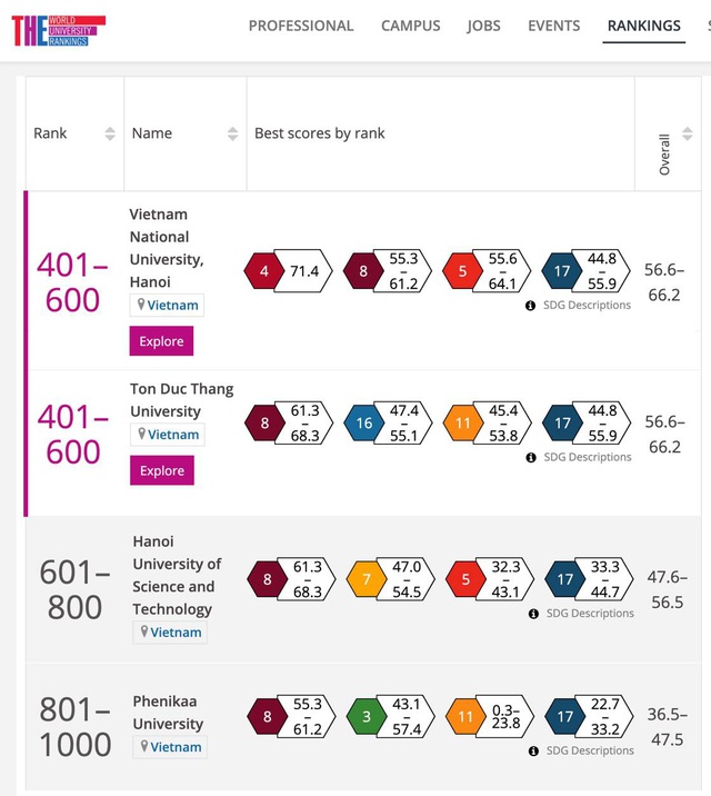 Thứ hạng các cơ sở giáo dục đại học Việt Nam trong BXH THE Impact Rankings (Nguồn: timeshighereducation.com)