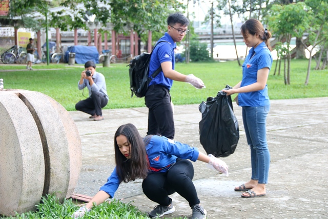 Đoàn viên sinh viên nhặt rác ở công viên trước Trường ĐH Sư phạm