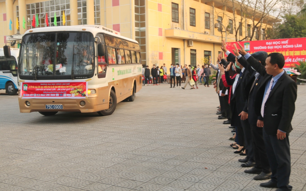 Lãnh đạo, cán bộ, giảng viên Trường ĐH Nông Lâm chào tạm biệt sinh viên khi các chuyến xe chuyển bánh