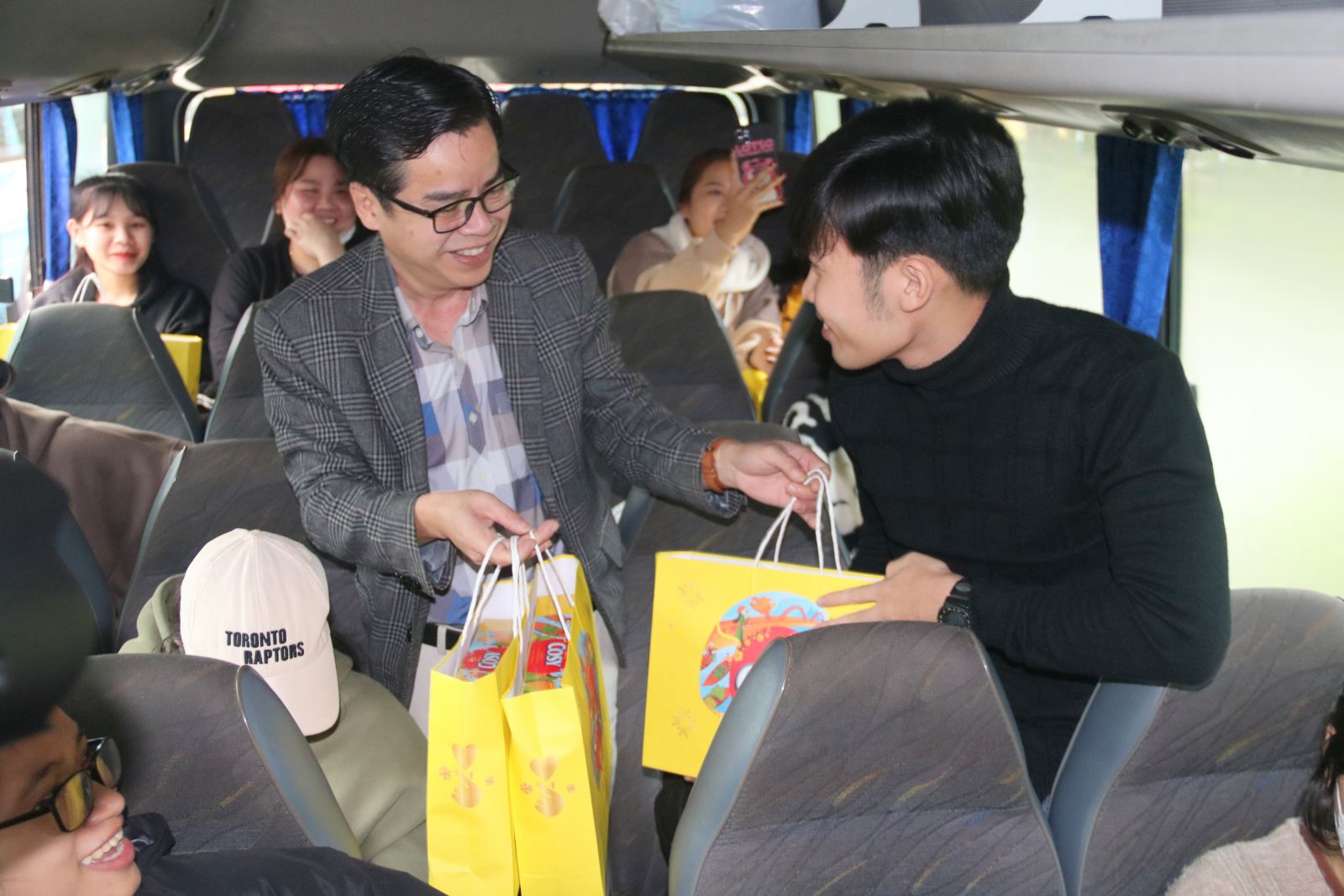Trước lúc xe chuyển bánh, lãnh đạo nhà trường cùng các phòng, ban lên từng chiếc xe nắm tay, dặn dò và tặng quà tết cho sinh viên.