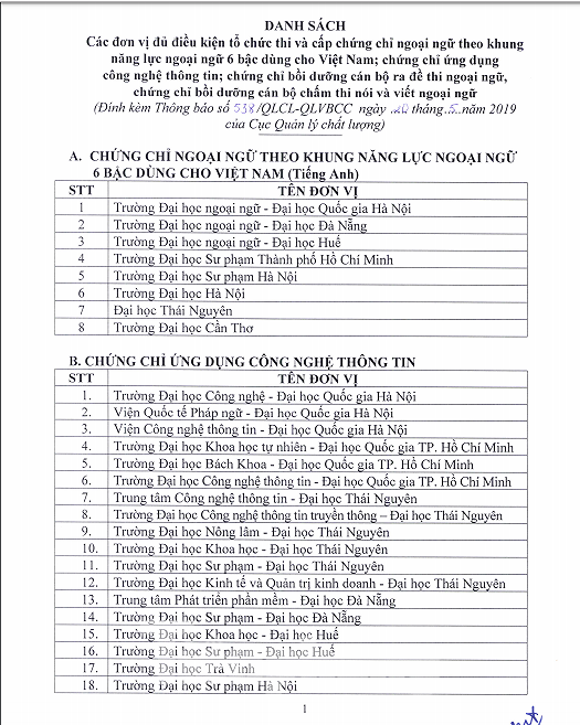 Bộ GD&ĐT đã công bố danh sách các đơn vị đủ điều kiện tổ chức thi và cấp chứng chỉ ngoại ngữ theo khung năng lực ngoại ngữ 6 bậc dùng cho Việt Nam và chứng chỉ ứng dụng công nghệ thông tin.