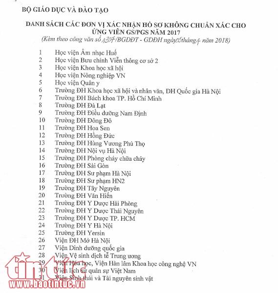 Kèm theo công văn này, Bộ GD-ĐT đã công bố danh sách các đơn vị xác nhận hồ sơ không chuẩn xác cho ứng viên GS, PGS 2017, cụ thể như sau:
