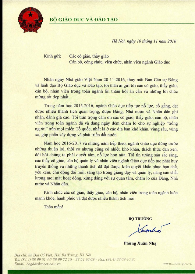 Nhân dịp ngày Nhà giáo Việt Nam 20/11, trong phần kết của bức thư, Bộ trưởng viết: “Tôi tin tưởng sâu sắc rằng, các thầy cô giáo, cán bộ quản lý và nhân viên ngành Giáo dục tiếp tục phát huy truyền thống và những thành tích đã đạt được, kiên quyết khắc phục hạn chế những yếu kém, chủ động đổi mới, sáng tạo trong giảng dạy và quả lý, nâng cao chất lượn mọi mặt hoạt động, xứng đáng với sự quan tâm, chăm lo của Đảng, Nhà nước và Nhân dân.