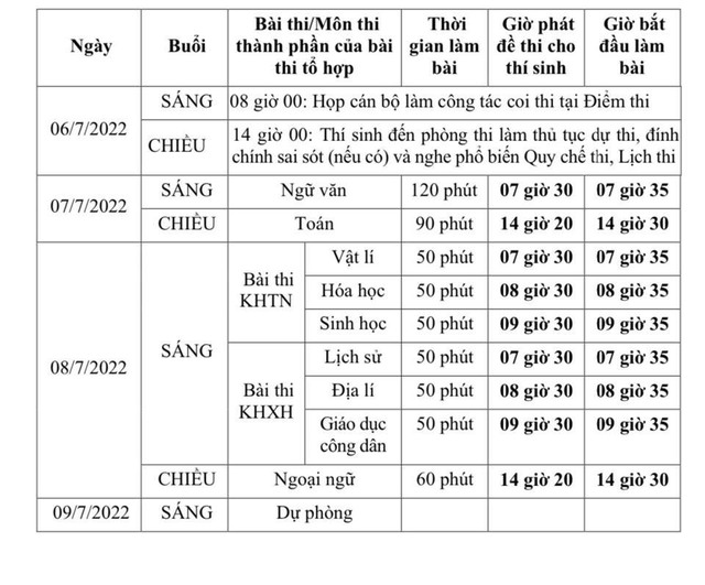 Các bài thi được giữ nguyên như những năm gần đây với ba bài độc lập Toán, Ngữ văn, Ngoại ngữ cùng hai bài tổ hợp là Khoa học tự nhiên (Vật lý, Hóa học, Sinh học) và Khoa học xã hội (Lịch sử, Địa lý, Giáo dục công dân đối với thí sinh học chương trình giáo dục phổ thông; hoặc Lịch sử, Địa lý đối với thí sinh học chương trình giáo dục thường xuyên).