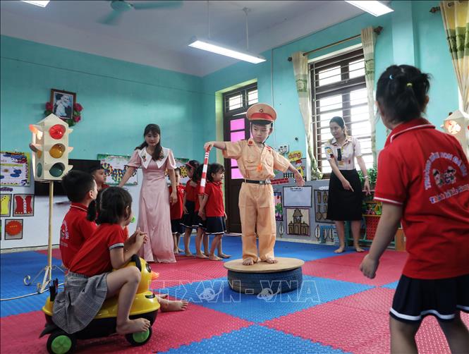Cô giáo hướng dẫn các bé thực hành tham gia giao thông đúng quy định tại trường Mầm non Đa Mai, thành phố Bắc Giang. Ảnh minh họa: Danh Lam/TTXVN
