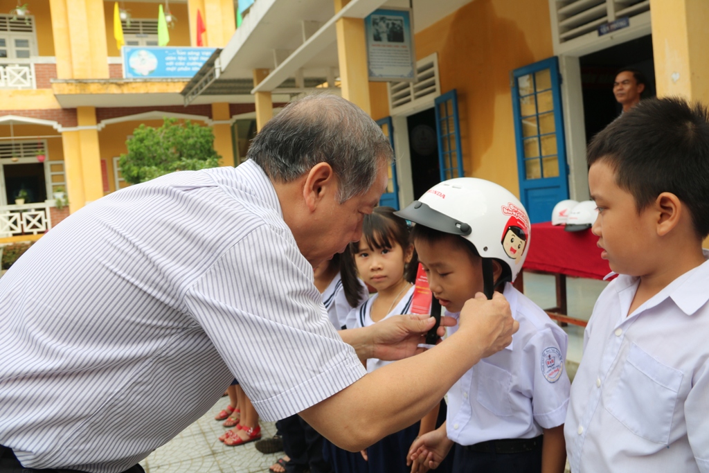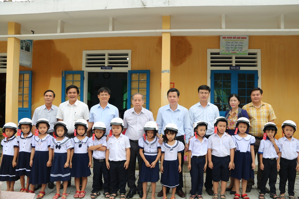 Chủ tịch UBND tỉnh Phan Ngọc Thọ cũng đã trao tặng mũ bảo hiểm cho các học sinh lớp 1 Trường tiểu học Trạch Phổ.