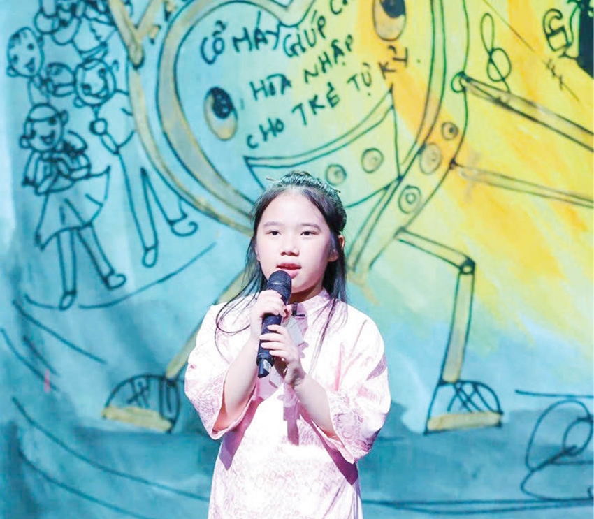 | Gia Hân thuyết trình tác phẩm “Cỗ máy giúp chữa lành, hòa nhập cho trẻ tự kỷ” tại cuộc thi. Ảnh: T. Tiên |