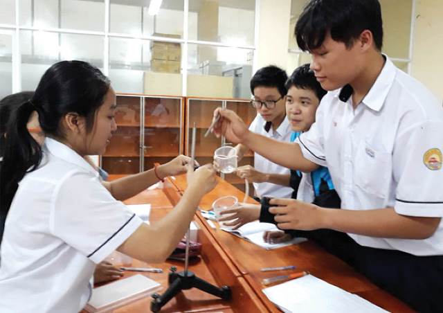Học sinh Trường THPT chuyên Quốc Học trong giờ thực hành (Ảnh chụp thời điểm trước bùng phát dịch COVID-19)