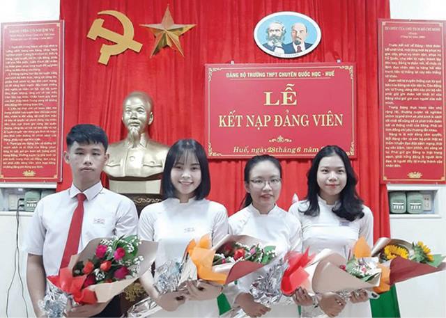 Kết nạp Đảng cho các đoàn viên ưu tú ở Trường THPT chuyên Quốc Học (Ảnh chụp thời điểm trước bùng phát dịch COVID-19)