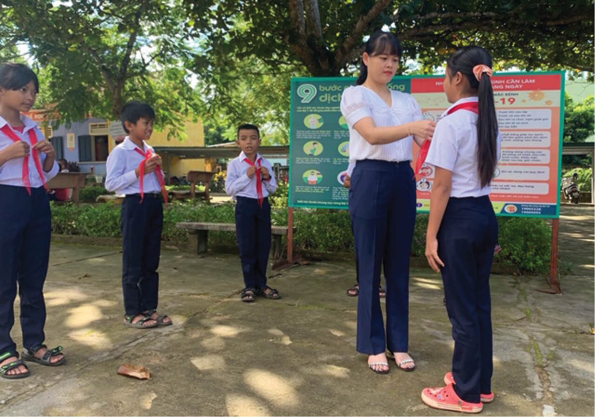 Cô Xuân hướng dẫn học sinh thắt khăn quàng