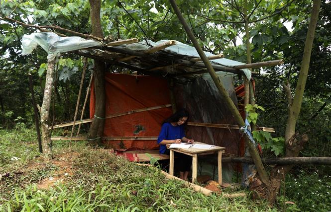 Học sinh miền núi dựng lán bắt sóng học online. Ảnh: Quốc Khánh/TTXVN