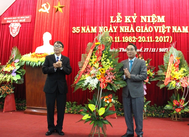 Mở đầu buổi lễ, PGS. TS. Nguyễn Quang Linh, Giám đốc ĐH Huế ôn lại truyền thống 35 năm ngày Nhà giáo Việt Nam (20/11/1982 – 20/11/2017), đồng thời chia sẻ những kết quả đạt được của ĐH Huế thời gian qua, đưa ra giải pháp và hướng phát triển trong thời gian tới.