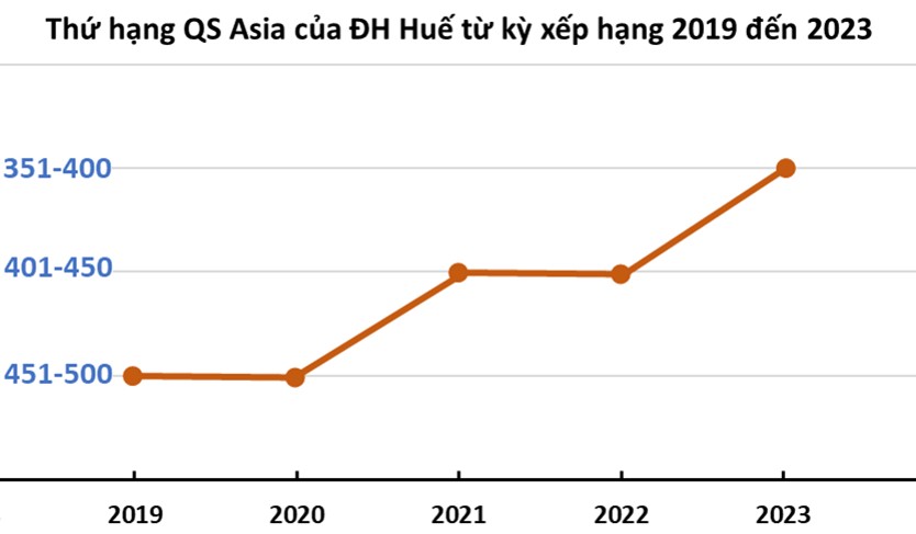 Không chỉ về thứ hạng chung, các chỉ số xếp hạng QS Asia đã cho thấy sự thăng tiến đều đặn của ĐH Huế qua những kỳ xếp hạng gần đây. Đơn cử, từ chỗ nằm ở nhóm 10% cuối bảng năm 2019, ĐH Huế đã vượt lên thuộc nhóm nửa trên bảng xếp hạng năm 2023.