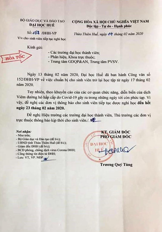 Đại học Huế thông báo cho sinh viên nghỉ học đến hết ngày 23/2